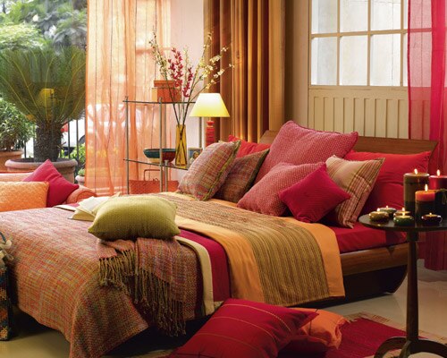 The rich chocolaty textures and colours of the bedroom on the left is right for an Indian winter. You can also change styles to match the seasons-will give your room an immediate facelift.