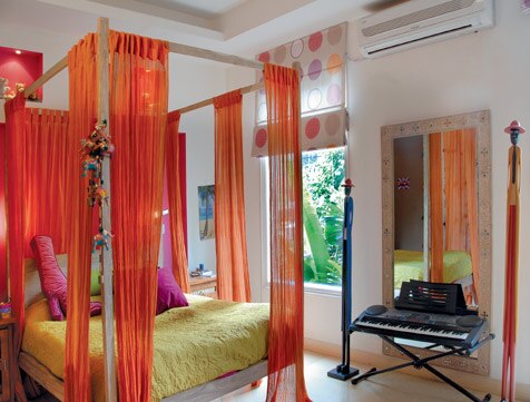 This bedroom blends simplicity with elegance. The elements of bold colours create a warm, contemporary setting, contrasting with the "framed" bed and whimsical curtains – a throw-back to colonial times. The thickened glass does away with ugly grills, even as the giant polkas on the drape pick up echos from the green, orange and magenta to create harmony.