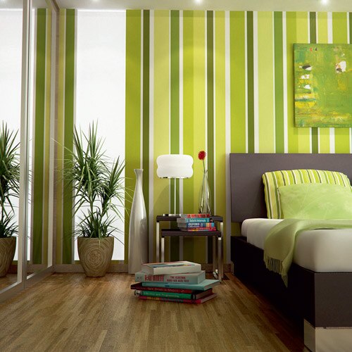 This homemaker has accentuated the beauty of her decor, despite very plain and minimal furniture by hanging bright green curtains on the french windows. The green colour echoes on cushion covers and in the green potted plants.