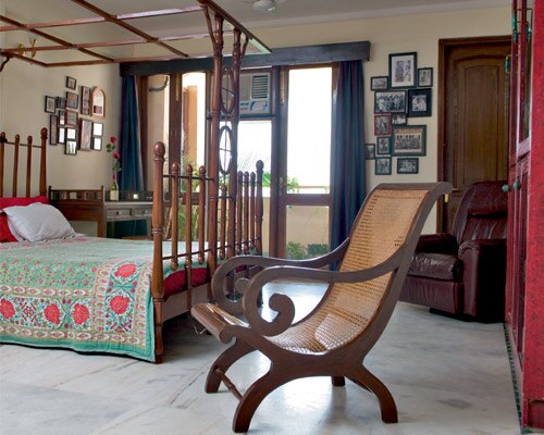 This homemaker loves the warmth of tradition. Here’s a classic yet fuss-free colonial tableau complete with the bed, the writing table, easy chair and the traditional Rajasthani bedcover. Wall decor comprises black-and-white family photographs.