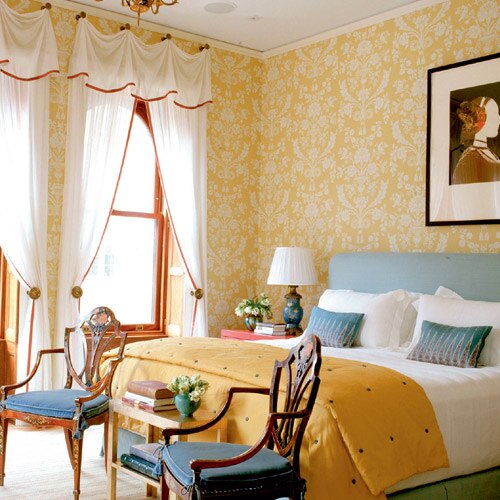 This yellow-blue decor gives the feel of bright yellow sunshine spread in clear blue sky. The white curtains allow lots of natural light, making the bedroom look bigger and brighter.