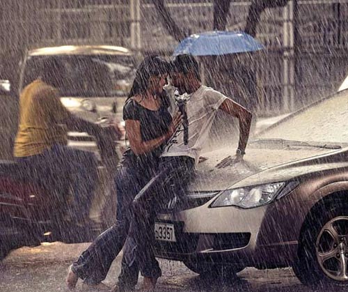 The on-screen couple enjoy the rains in the movie.