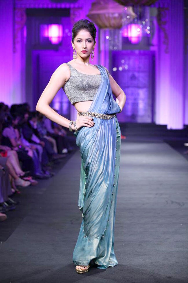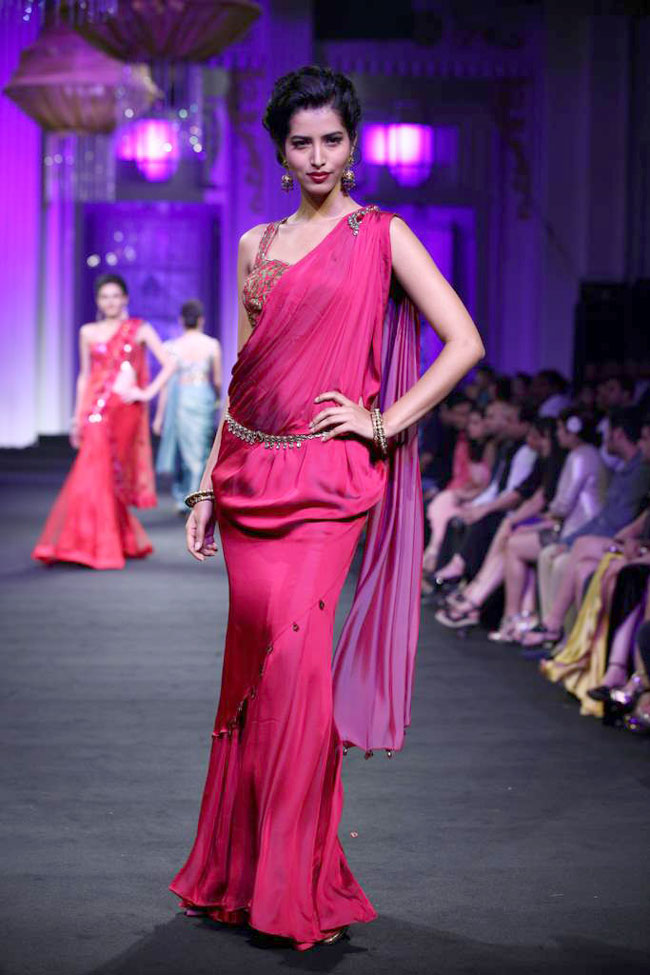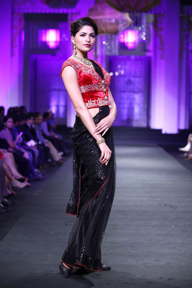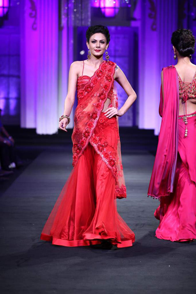 The collection was called 'Mystical Romance'. It showcased a variety of bridal pre- draped saris, sari gowns, anarkalis and lehengas in colours like black, gold, amber, coral, blue and red.