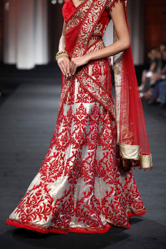 Rich luxurious fabrics ranged from silk, chiffon to velvet, tulle and lace in vibrant colours that moved from black, amber, coral to blues and the traditional auspicious red.