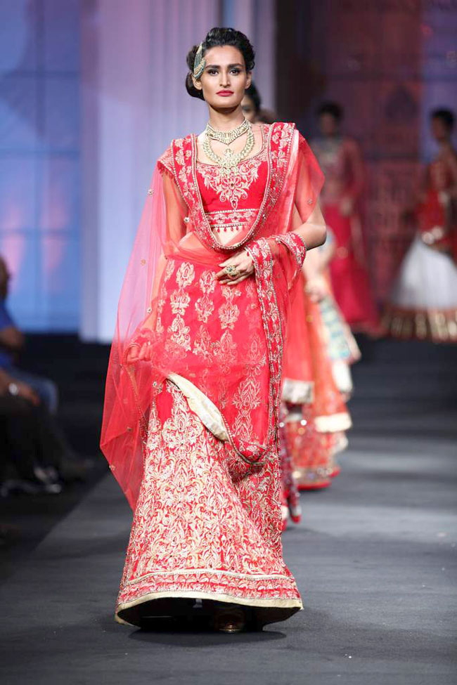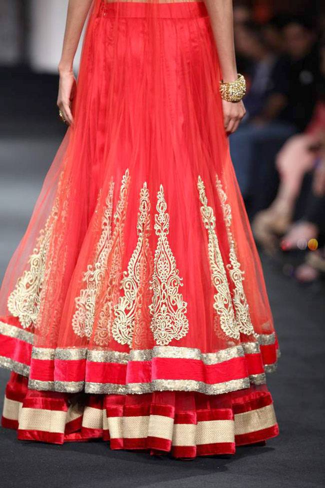 The final pink and red section had tiered net lehengas with the net choli kurtas, while lace blouses were teamed with metres of net for swirling lehengas. Crystals gleamed on velvet cholis and dupattas to add that definite touch of bridal glamour.