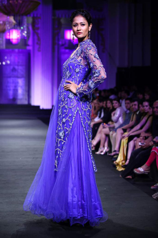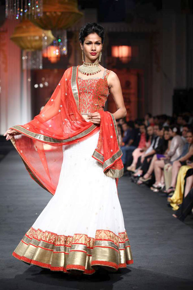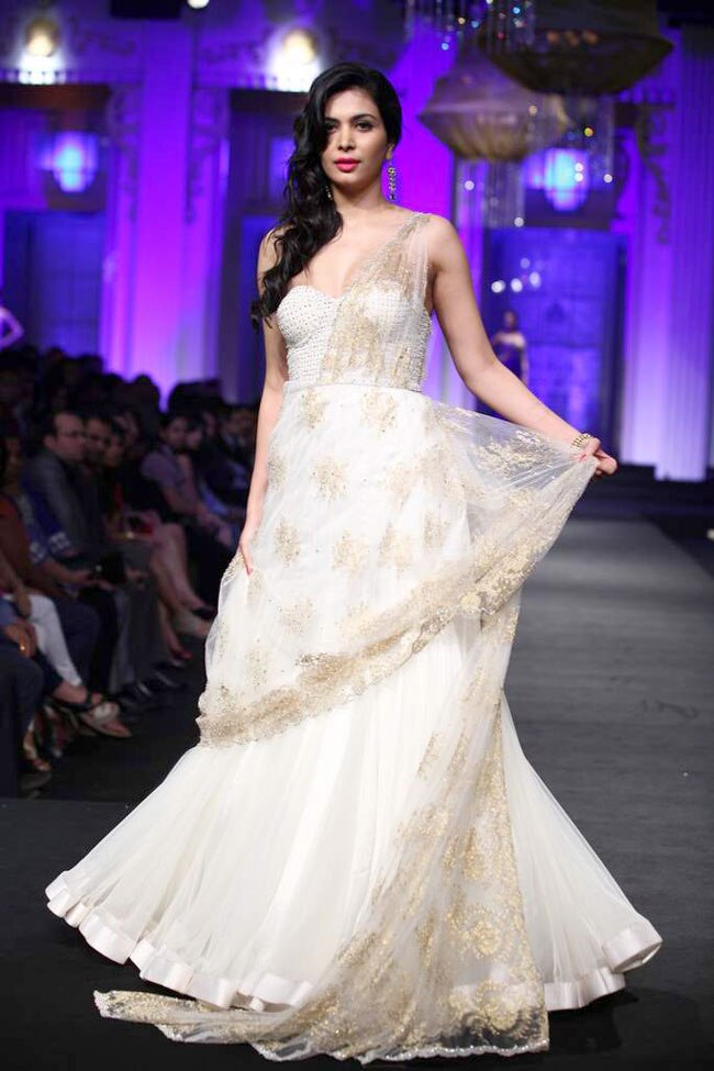 Six giant lit wired gold shimmering net chandeliers with crystal streamers stayed poised on the ramp to gradually rise as the show started. Ornate white and gold pillars lined the stage all set for a grand evening of fashion and glamour. Opening the show was the lovely Ankita Shorey, Miss India 2011 and the face of the Aamby Valley Bridal Fashion Week 2012; in a white net and silk layered one- shoulder gown with gold zari work.
