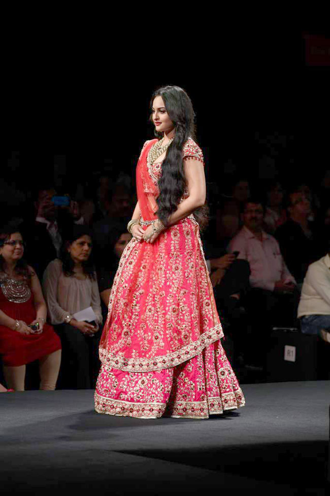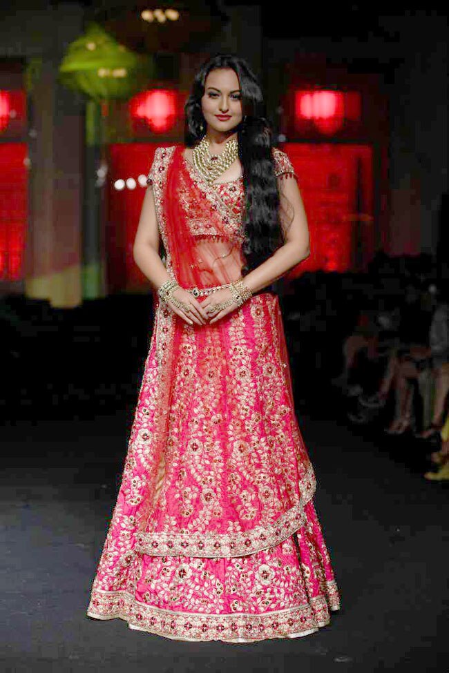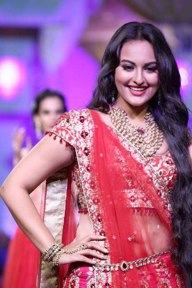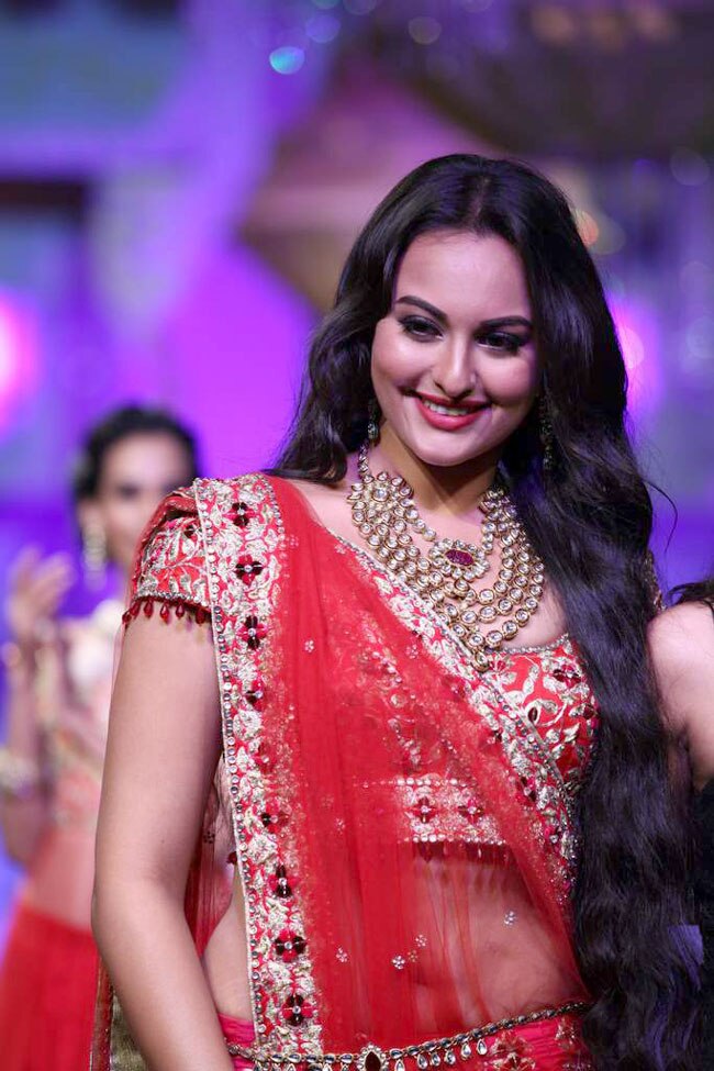 Sonakshi looked spectacular in a red bridal lehenga-choli with heavy goldwork and gold jewellery.
