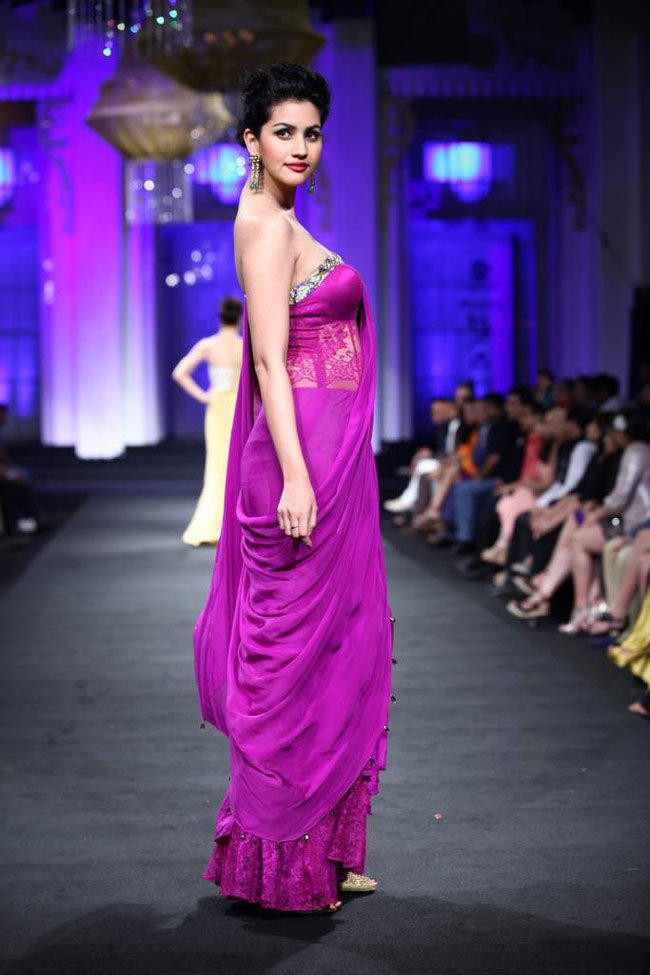The gold lace asymmetric draped gown and the mauve fuchsia draped sari-gown vision were divine in structure and beauty.