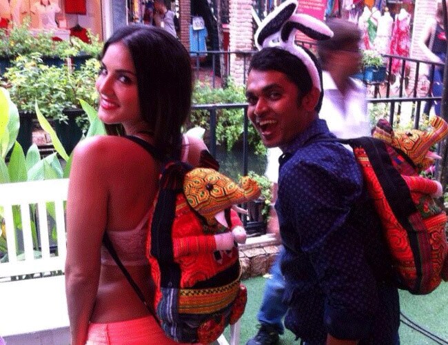 Do you like the bag...or the girl? Sunny having fun on the sets of Mastizaade.