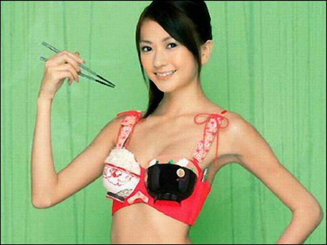 My Chopsticks Bra The chopsticks bra comes with a pair of collapsible chopsticks with a design theme of "the Japanese dining table". The right cup consists of a rice-bowl, the left cup a miso-soup-bowl, and a removable chopsticks-rest lies between the cups.
