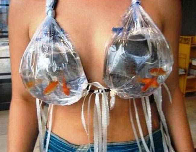 Goldfish bra Take your pet goldfish on a ride with this bra.